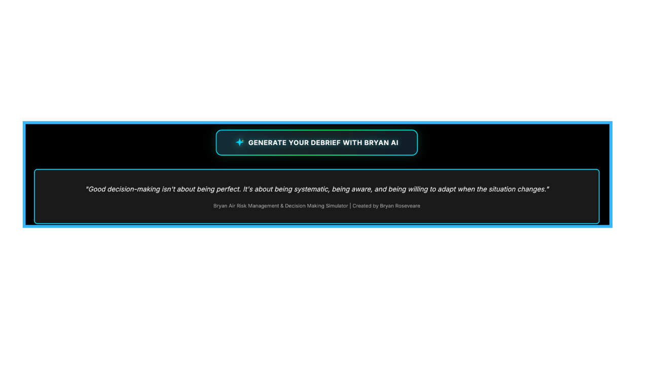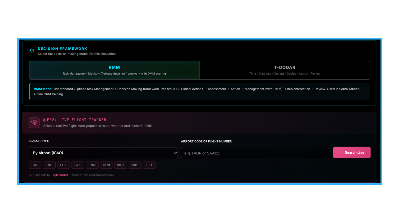 It pulls real flights from Flightradar24, generates dynamic scenarios using AI, walks you through structured decision-making frameworks like RMM and T-DODAR, and then gives you an AI-powered debrief on how you performed. It does one thing. It does it well. It does nothing else. That is the point.